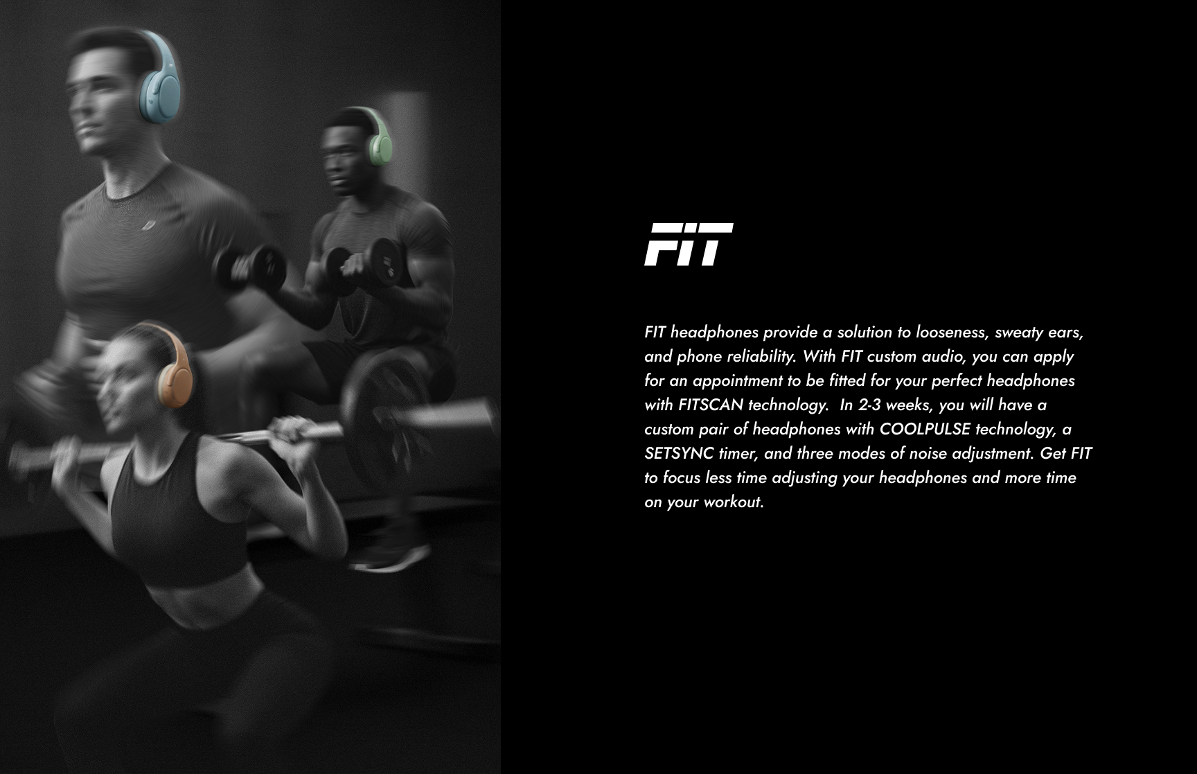 FIT headphones provide a solution to looseness, sweaty ears, and phone reliability. With FIT custom audio, you can apply for an appointment to be fitted for your perfect headphones with FITSCAN technology. In 2-3 weeks, you will have a custom pair of headphones with COOLPULSE technology, a SETSYNC timer, and three modes of noise adjustment. Get FIT to focus less time adjusting your headphones and more time on your workout.